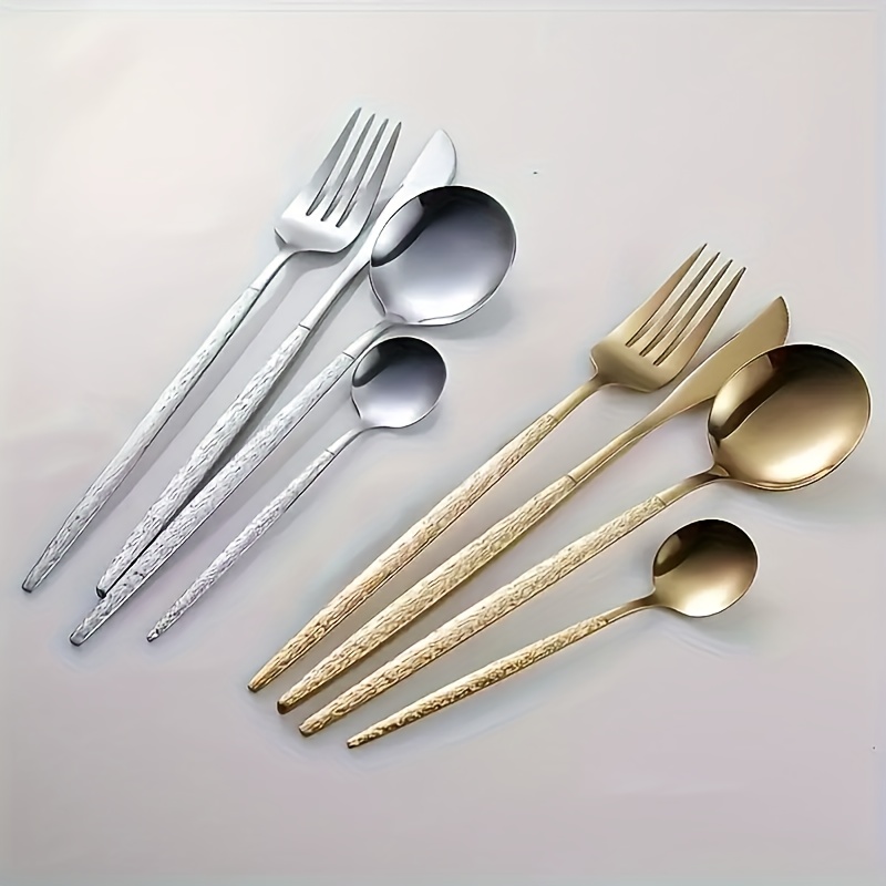 Matte gold silverware set adds the perfect touch of class and refinement to any place setting. Its modern silhouette and design, the slim profiles and pointed stems add a sophisticated, minimalist touch to your dinner table. With sleek simple design, the elegant gold flatware is perfect for family daily use, parties, wedding, hotel, restaurant, formal dinner, etc.