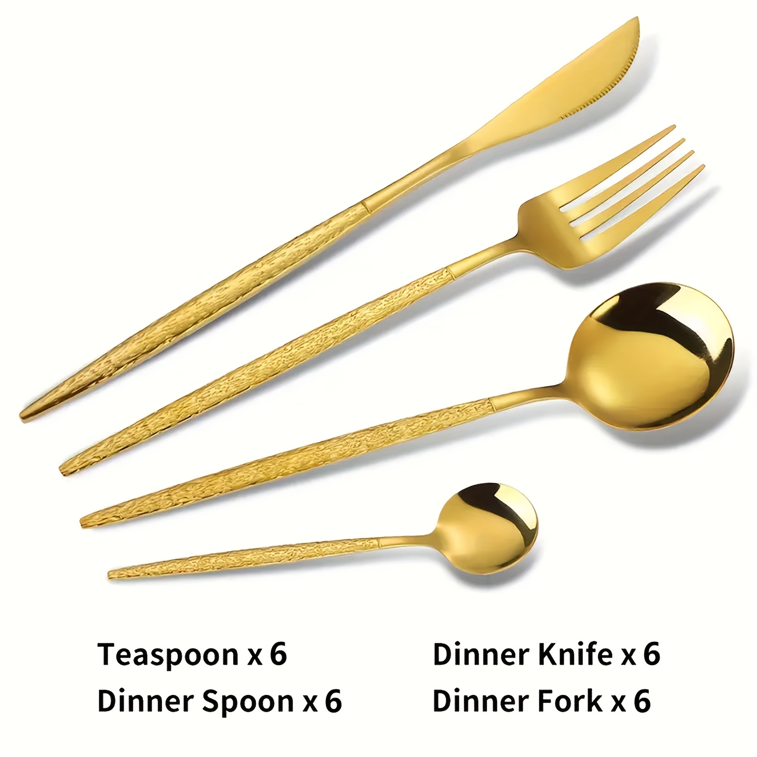 24 piece gold silverware set for 6 includes 6 Steak Knife, 6Meal Fork, 6Meal Spoon, and 6 Dessert Spoon,dessert forks in normal size, perfect for most families.