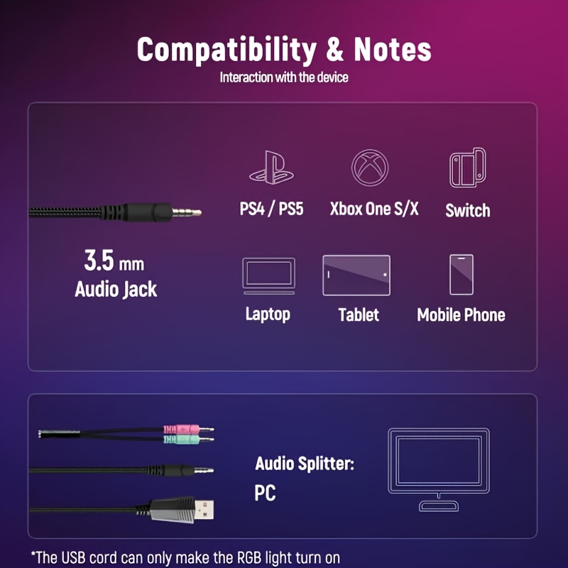 This product is compatible with multiple platforms. The gaming headset features a 3.5mm audio jack, making it suitable for PS4, PS5, PC, Xbox One, Xbox One S/X, laptops, Mac, PlayStation 3, tablets, and smartphones. Simply plug it in to connect to PS4/PS5 without any setup. The USB port is solely for powering the RGB lights.