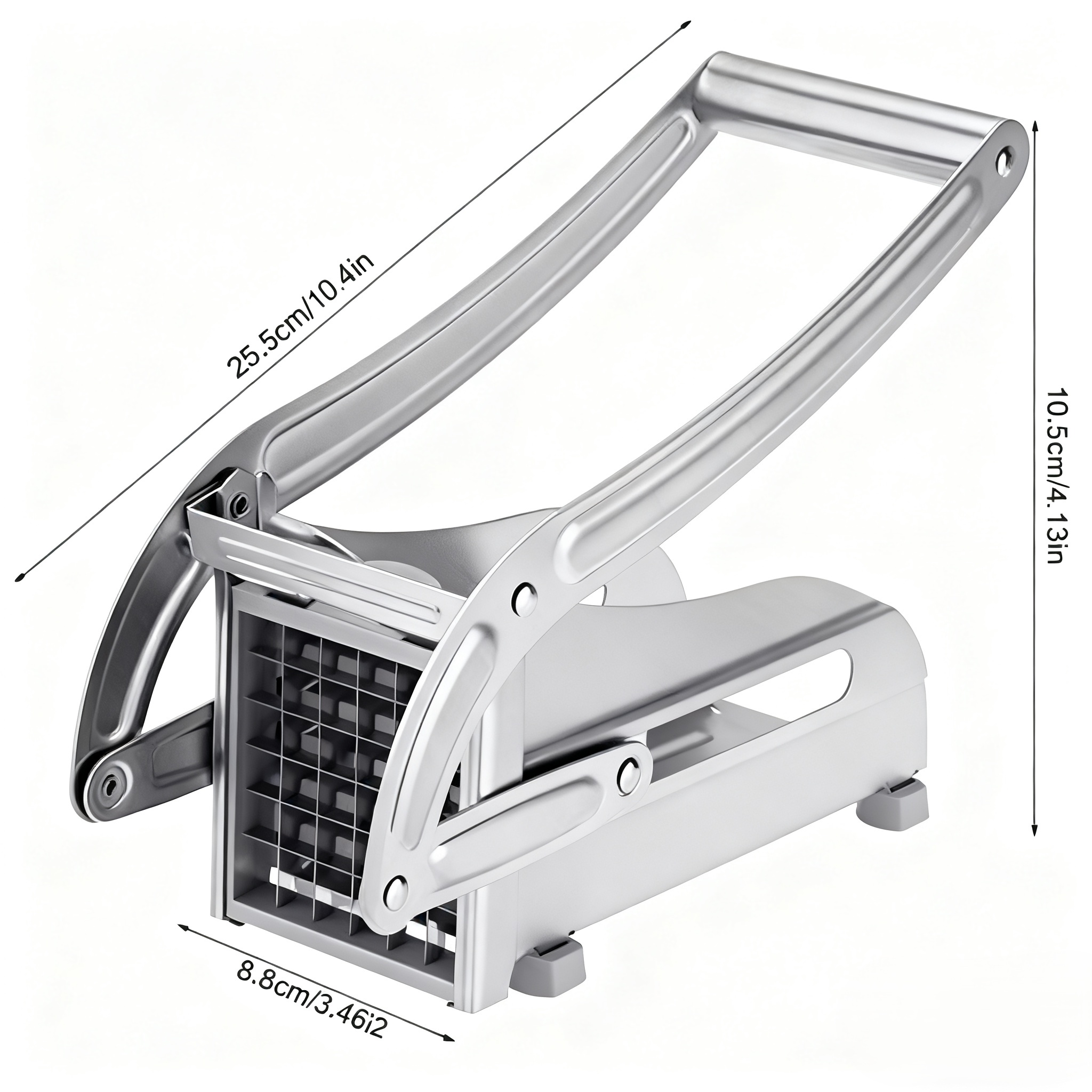 Introducing this premium stainless steel French fry cutter, a must-have kitchen tool for effortlessly creating perfect, uniform fries and more. Crafted from durable stainless steel, this cutter features an ergonomic design with a sturdy lever that allows you to slice potatoes, carrots, cucumbers, and other vegetables into crisp, evenly sized strips or cubes with minimal effort. It comes with multiple interchangeable cutting grids to customize the thickness and shape of your cuts, making it ideal