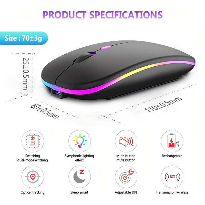 This rechargeable gaming mouse operates on a 2.4GHz wireless frequency and showcases bright RGB lighting. It is crafted for both office professionals and content creators, with an ergonomic design that promotes extended use and quiet clicks to minimize interruptions. Experience customizable DPI settings for accurate control in gaming or design tasks, and the USB-C rapid charging feature guarantees reduced downtime. Simply connect the USB dongle, utilize the wireless link, and illuminate your workspace with vibrant RGB zones—perfect for home office arrangements and festive presents.